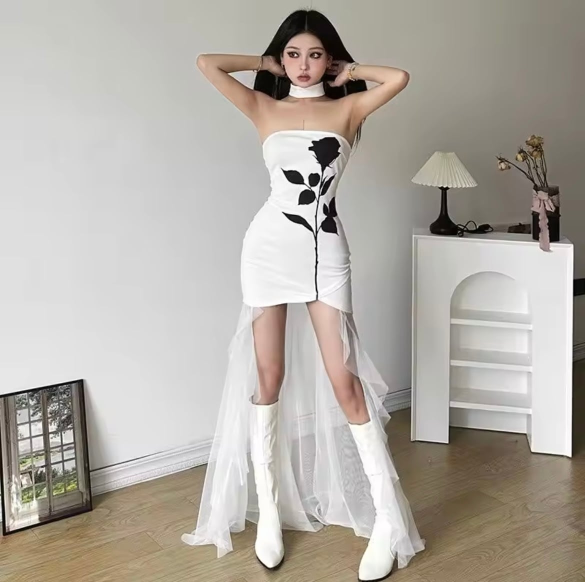 エレガンスとスタイリッシュを兼ね備えた、「ブラックローズプリント ショートドレス ホワイト チューブトップ スリム」です!
