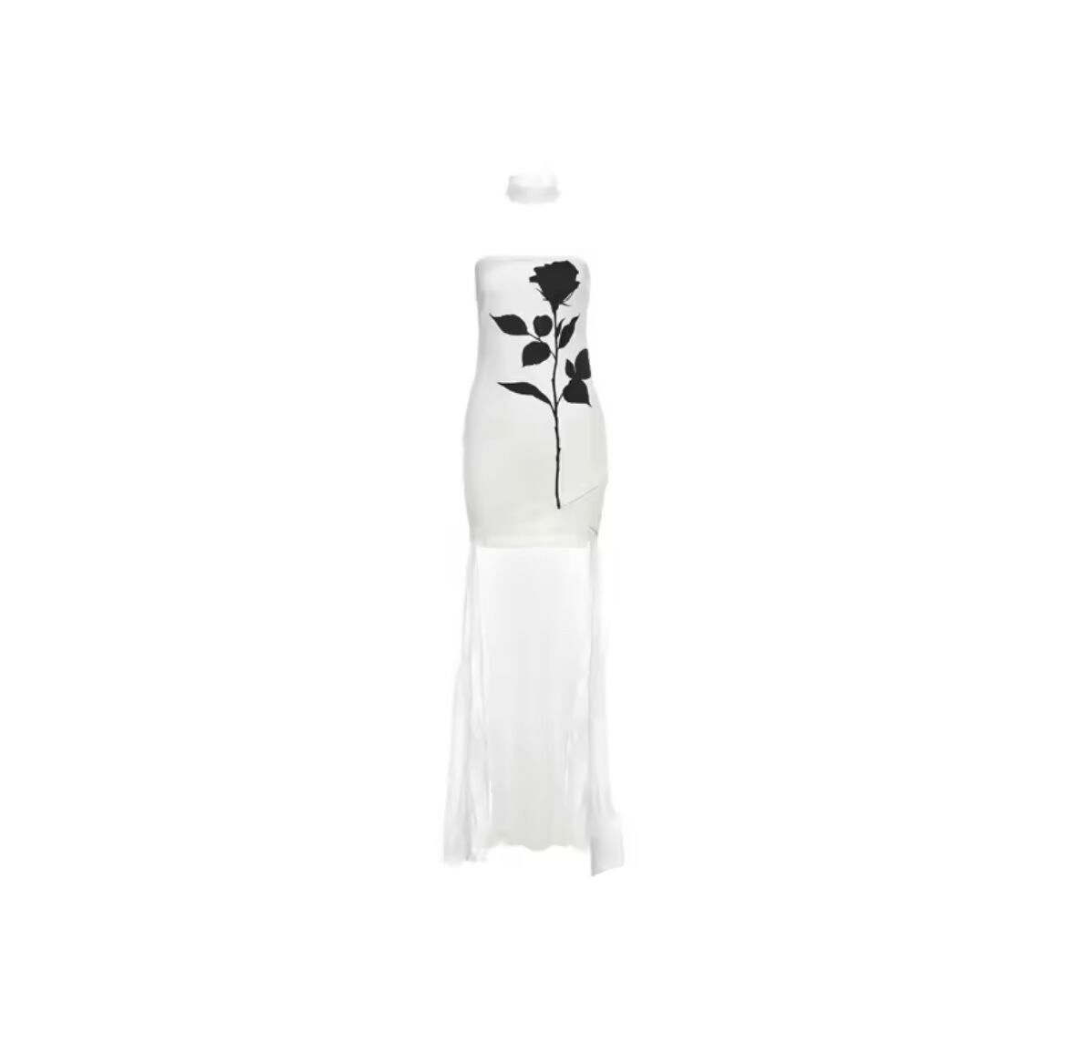 【2025新モデル】ブラックローズプリント ショートドレス ホワイト チューブトップ スリム