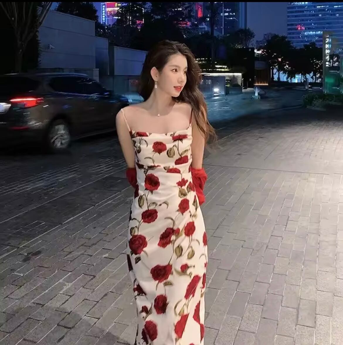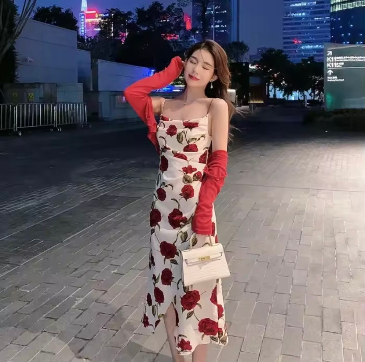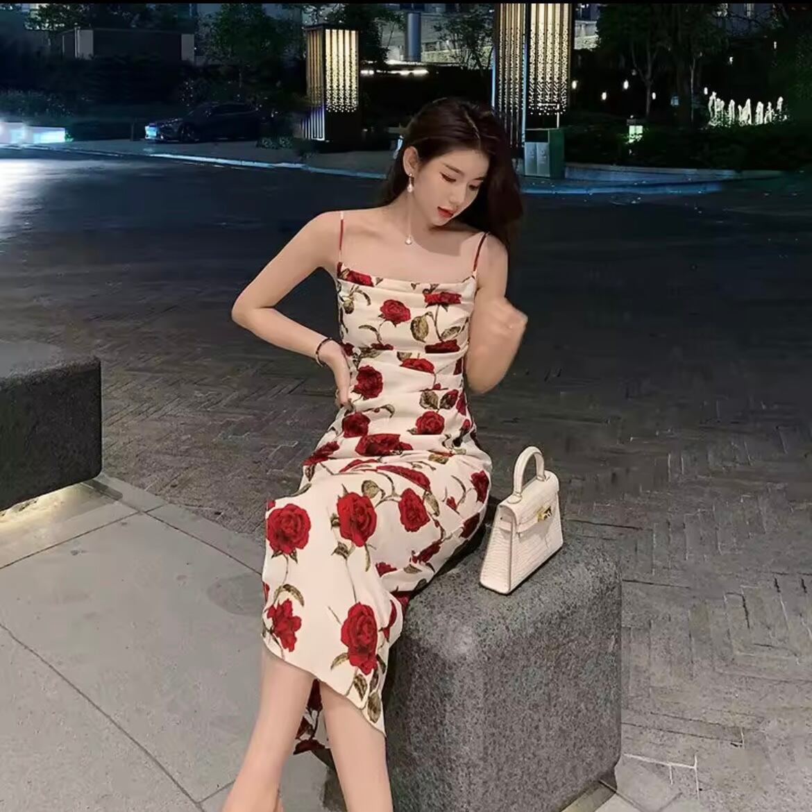 『魅力的なローズデザインが映える、洗練されたリラックスドレス』