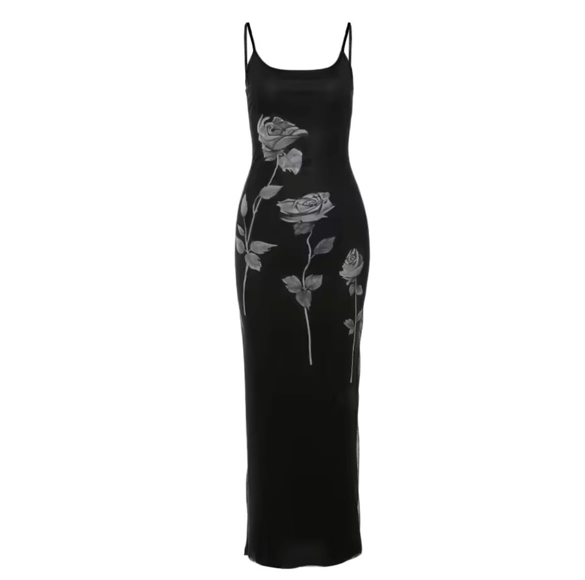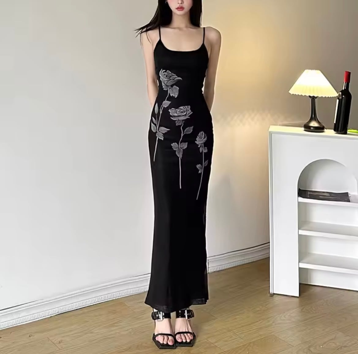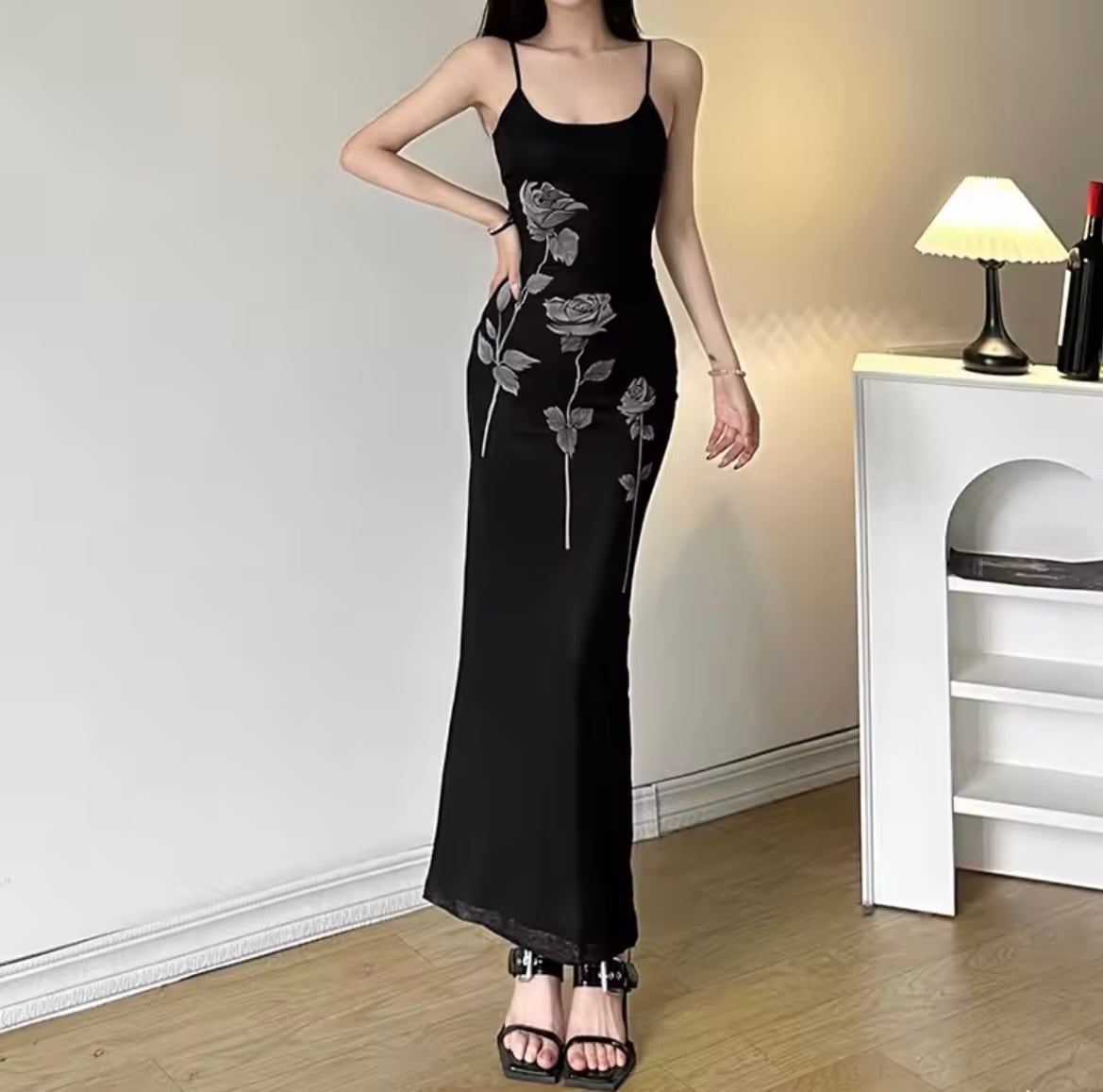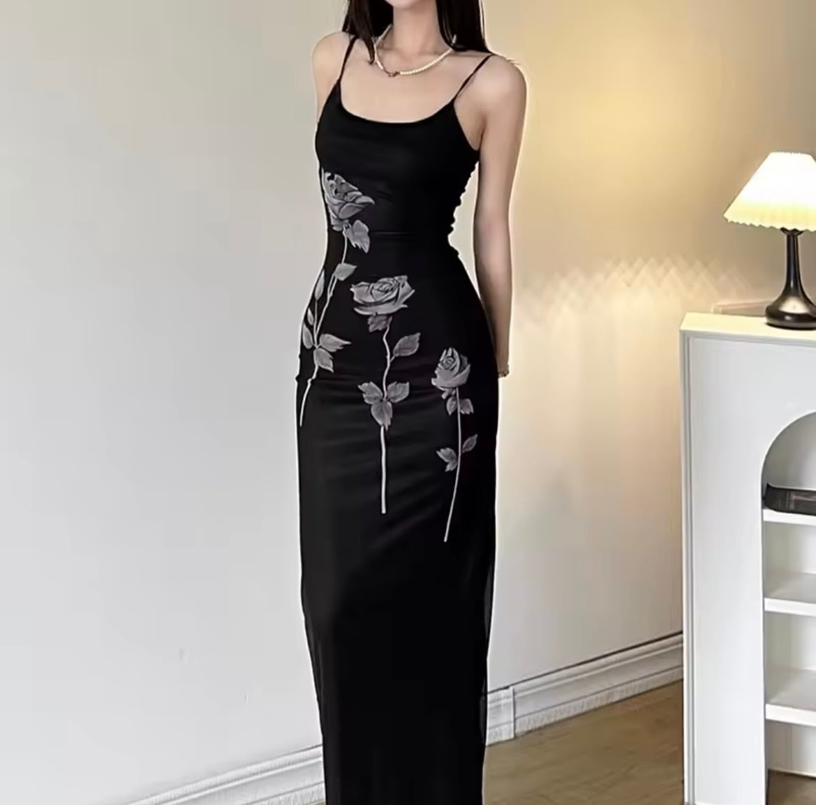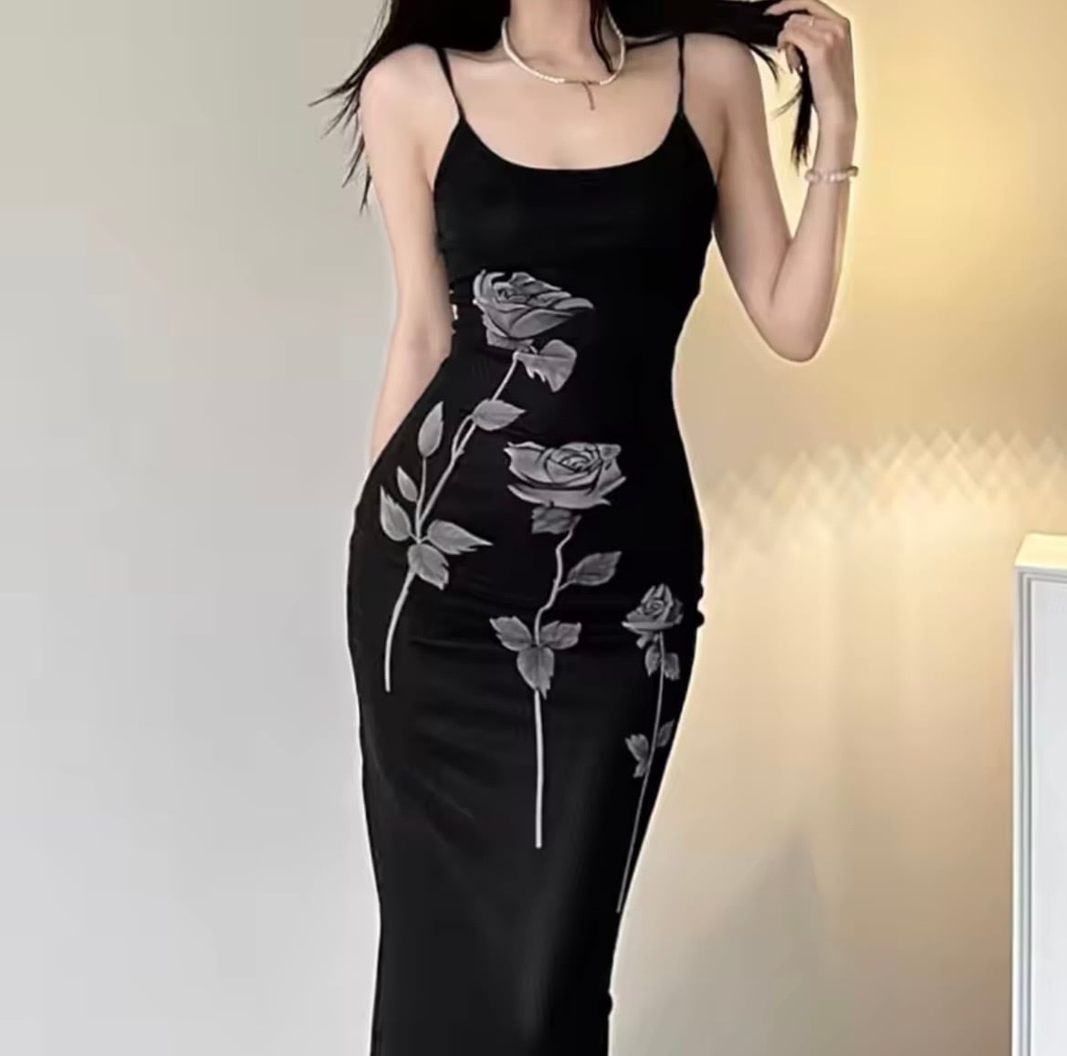 あなたのファッションにエレガンスと魅力を加える、このローズプリント タイト ストラップ ロングドレスをぜひお楽しみください!